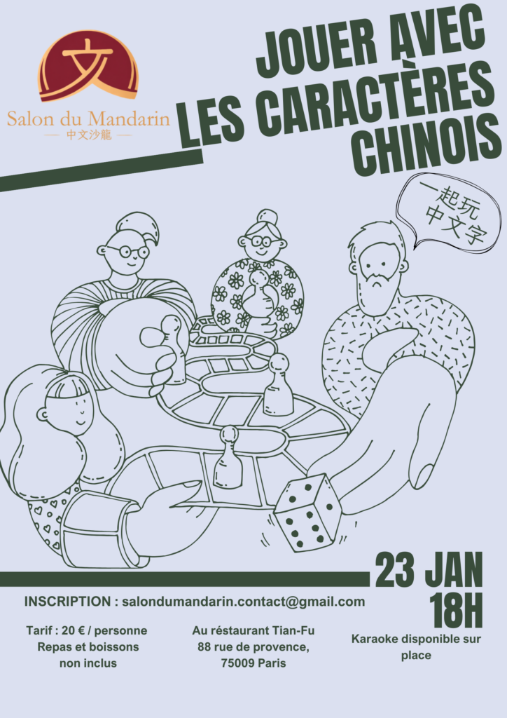 Le Salon du Mandarin (中文沙龍) et Mandyssée vous propose une soirée ludique et immersive autour de jeux de société en mandarin et d’une initiation au mahjong, conçue pour renforcer la reconnaissance des caractères de manière naturelle, détendue et conviviale, tout en favorisant les échanges entre apprenants.
