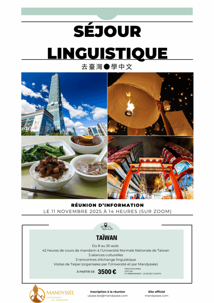 Cette rencontre permettra de présenter le programme du séjour linguistique à Taïwan, prévu du 8 au 30 août 2026, et d’échanger sur les modalités et le tarif estimé du voyage.